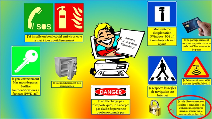 - Respecter les règles de navigation sécurisée (préférer les sites HTTPS, liens officiels, moteurs de recherche).